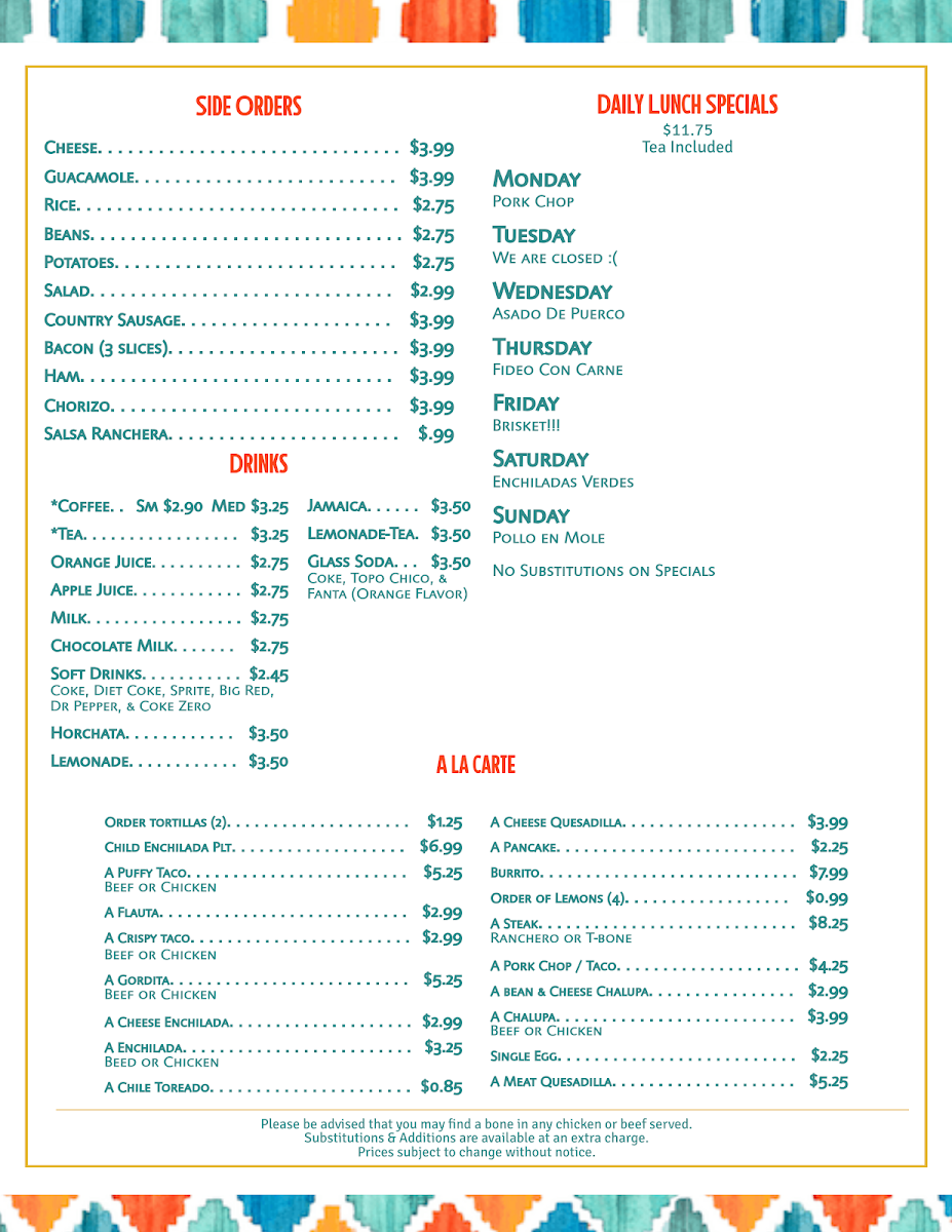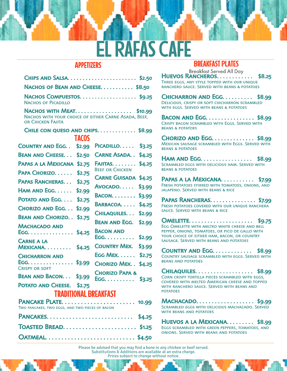 At El Rafas Cafe Menu, you'll find a delightful mix of flavors that will make every visit memorable. Located at 1535 W Hildebrand Ave in San Antonio, this cozy spot offers a warm, inviting atmosphere perfect for enjoying a hearty meal with friends or family. The menu features a variety of comforting dishes that combine traditional and contemporary flavors, from savory breakfast options to satisfying lunch and dinner choices. Whether you're craving a freshly made sandwich, a flavorful bowl of soup, or something sweet to round off your meal, there's something to please everyone.
